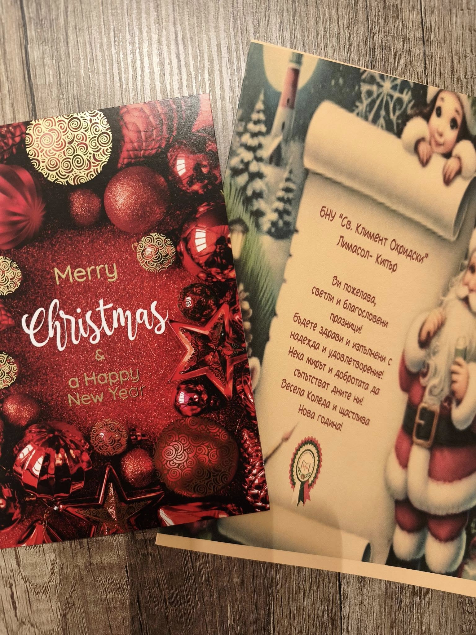 Особено трогателна изненада пристигна от далечен Кипър – от БУ „Св. Климент Охридски“ – Лимасол. Нашите първокласници бяха зарадвани с прекрасни коледни картички с мили пожелания, които донесоха усмивки и вълнение и показаха, че коледният дух няма граници.