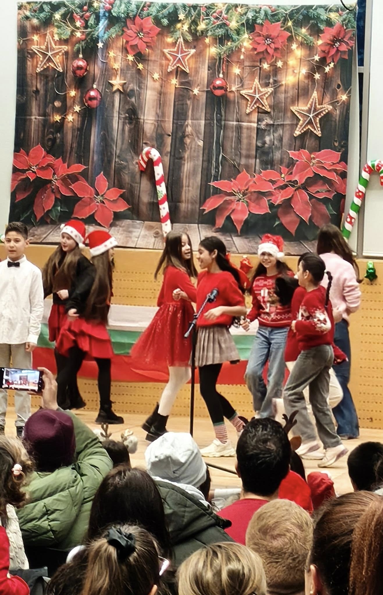 Празничната програма беше богата и разнообразна – звучаха коледни песни, сцената оживя с танци на снежинки и звънчета, а веселите коледни шапчици допълниха магията на празника. Учениците от 3-ти клас представиха театралната постановка „Дядовата ръкавичка“, която впечатли публиката с артистичност и искрено детско присъствие.